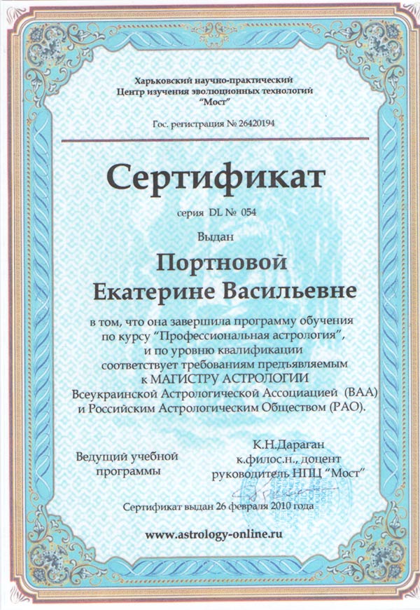 Обучалась у известного украинского астролога Константина Дарагана, человека, которого я глубоко уважаю как профессионала своего дела и считаю одним из лучших астрологов на постсоветском пространстве.